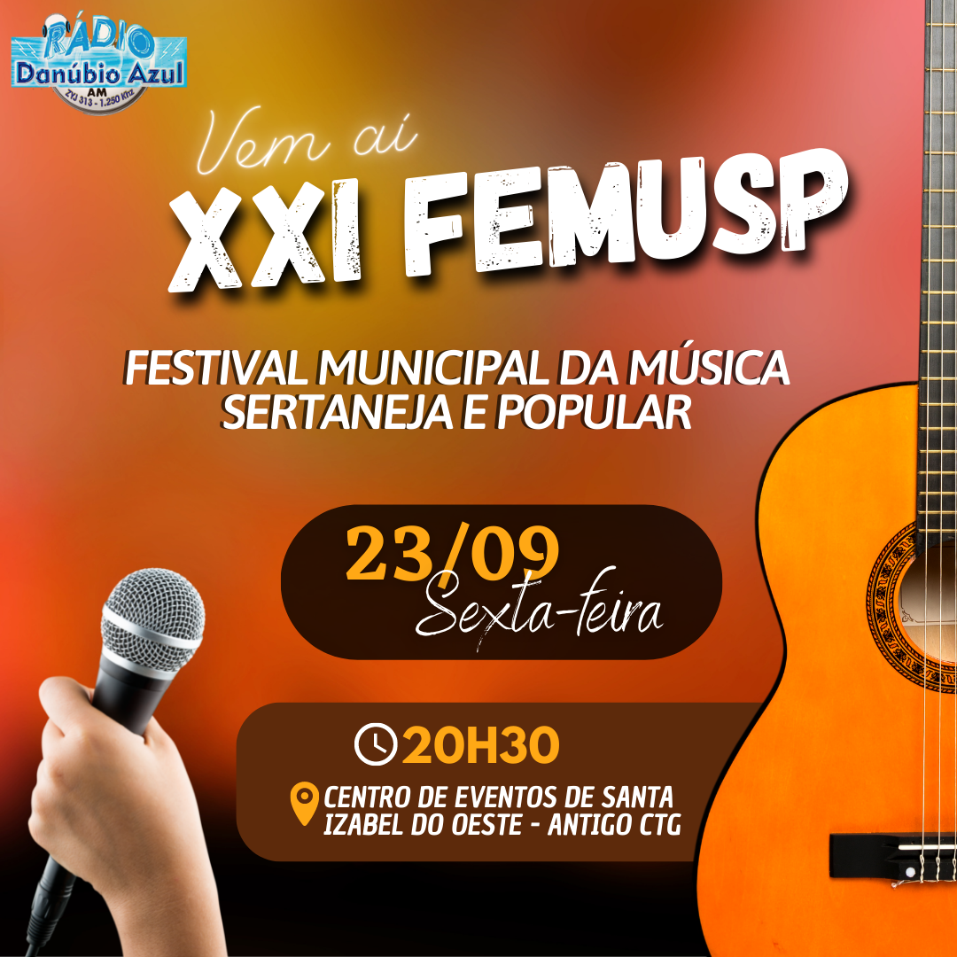 O XXI FEMUSP - Festival Municipal da Música Sertaneja e Popular acontece na próxima sexta-feira, dia 23 de setembro. A partir das 20h30 os calouros subirão no palco e farão suas apresentações na categoria Juvenil e Adulto.