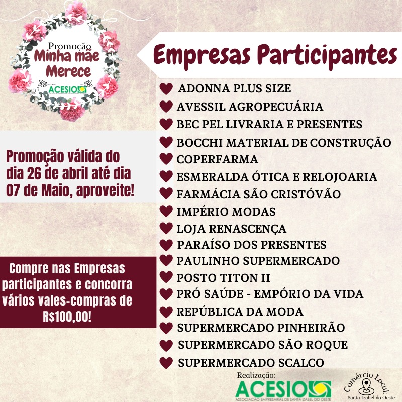 A Diretora de Assuntos do Comercio da Associação Empresarial de Santa Izabel do Oeste, Fernanda Dreher Netto, esteve participando do Jornal do Meio Dia Bocchi da Rádio Danúbio Azul, para trazer mais informações da promoção. A promoção "Minha mãe merece" em parceria com o Comércio Local, sendo exclusiva para empresas associadas.