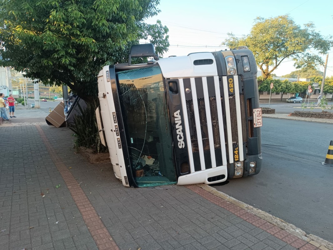 Caminhão carregado com tabaco tomba no centro de Marmeleiro