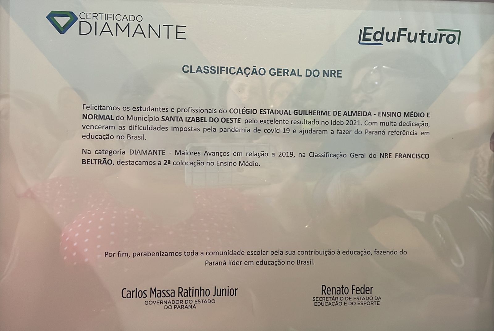 O Colégio Estadual Guilherme de Almeida recebeu o certificado Diamante, ficando no geral em 2° lugar na categoria do Núcleo Regional de Educação de Francisco Beltrão. Diani explica que a cada dois anos é realizado o IDEB, onde é calculado a partir dos dados a aprovação escolar. A prova foi feita em 2019.