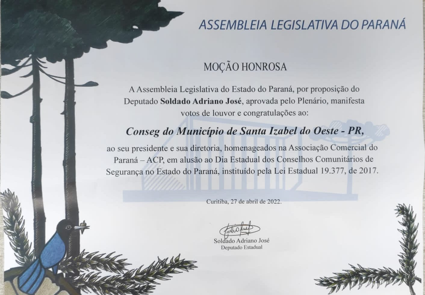 O Conselho Comunitário de Segurança de Santa Izabel do Oeste (Conseg), recebeu Moção Honrosa da Assembleia Legislativa do Estado do Paraná (ALEP). A moção foi proposta pelo Deputado Estadual Soldado Adriano José, em alusão ao Dia Estadual dos Conselhos Comunitários de Segurança no Estado do Paraná, instituído pela Lei estadual 19.377 de 2017.