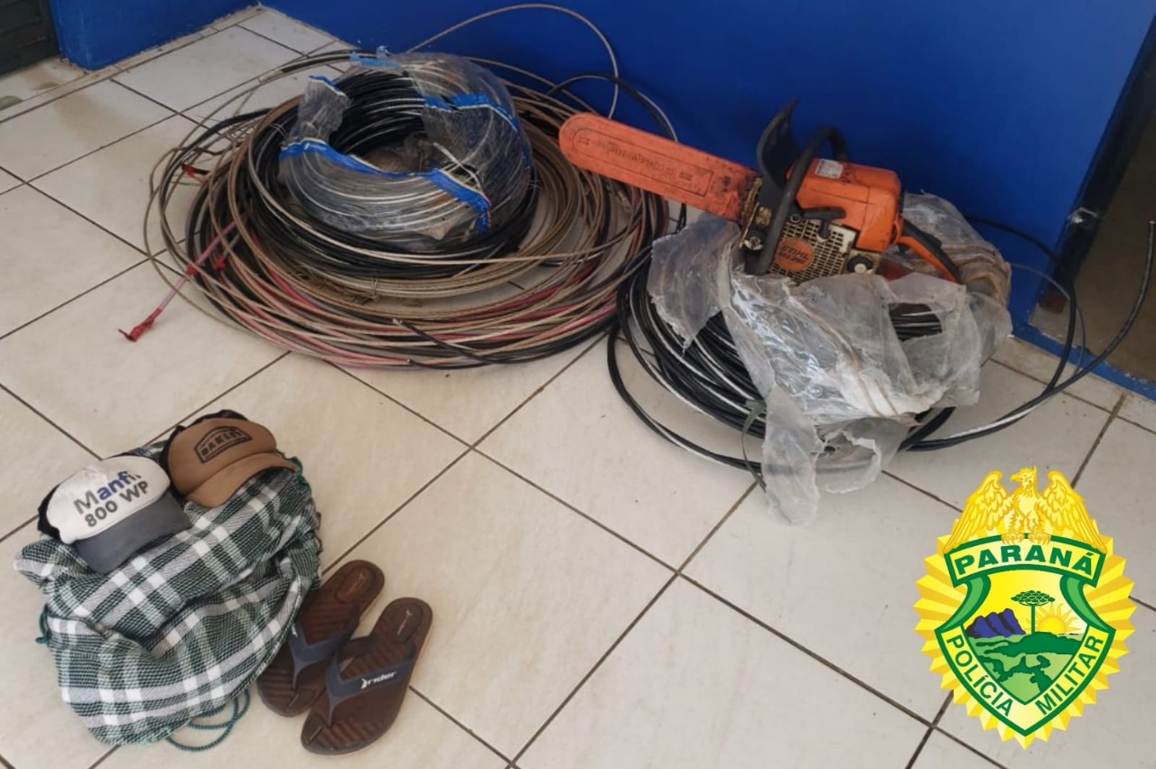Na ação policial foi recuperado uma motosserra, duas bobinas com aproximadamente 130 metros de cabos elétricos, dois bonés, um chinelo, uma rede pra descanso e também identificado um terceiro envolvido, o qual não foi localizado.