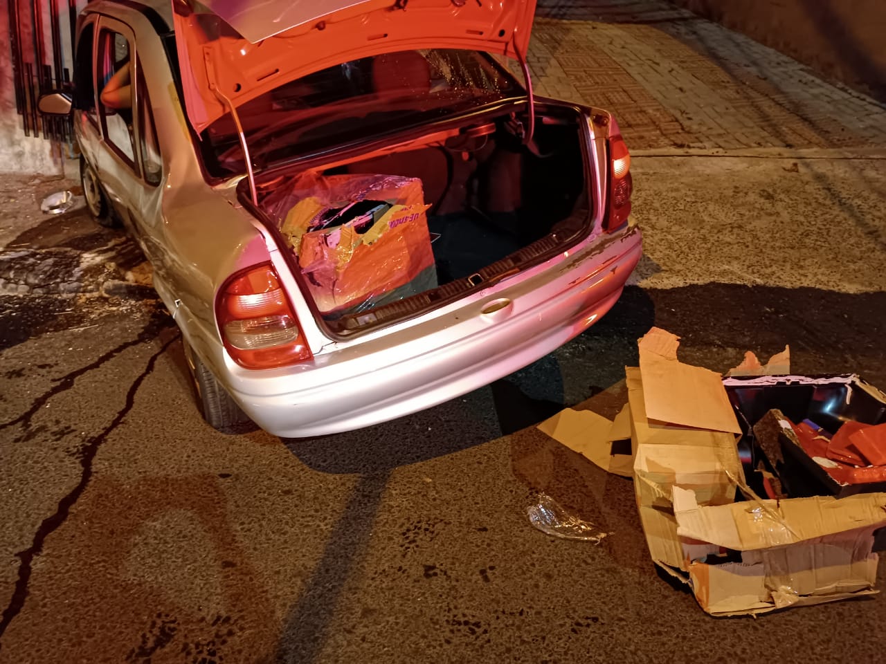 Em abordagem foram encontradas quatro pessoas com quase R$ 15 mil em espécie o que gerou suspeita e fez com que os policiais fossem até a casa de um dos envolvidos para verificar a existência de outros produtos ilícitos. Perto da casa os policiais flagraram um veículo Corsa fugindo em alta velocidade e durante acompanhamento o carro envolveu-se em um acidente e ficou praticamente destruído.