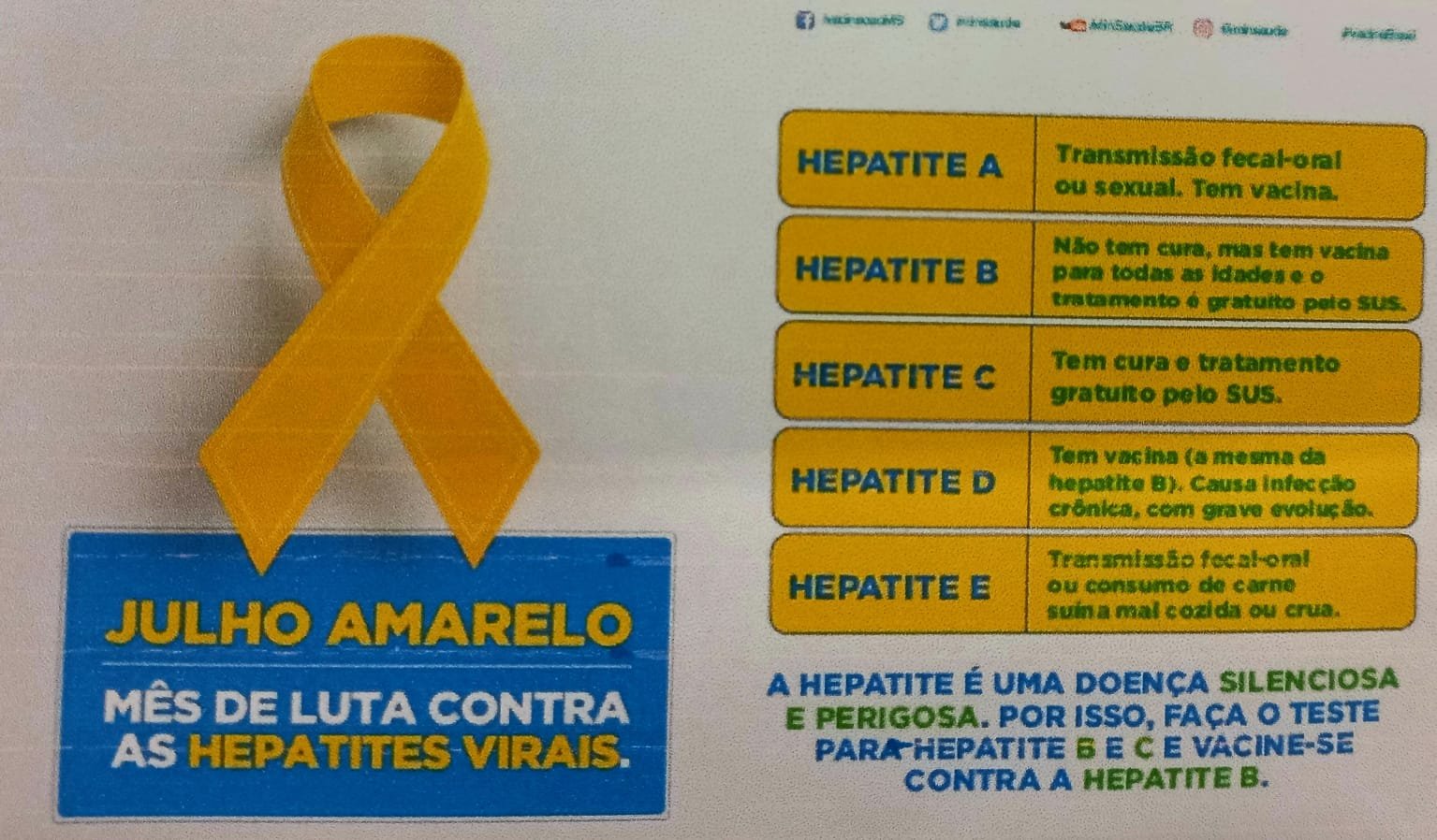 A Secretaria de Saúde de Santa Izabel do Oeste, esteve participando de um evento na Praça das Palmeiras no sábado dia, (02/07), com a realização de testes rápido de Hepatite B e C, e aferição da Pressão Arterial. O mês de julho, traz um alerta sobre o julho Amarelo Mês de Conscientização as Hepatites Virais. Durante todo este mês, os testes estarão à disposição da população Izabelense nas Unidades de Saúde do município.