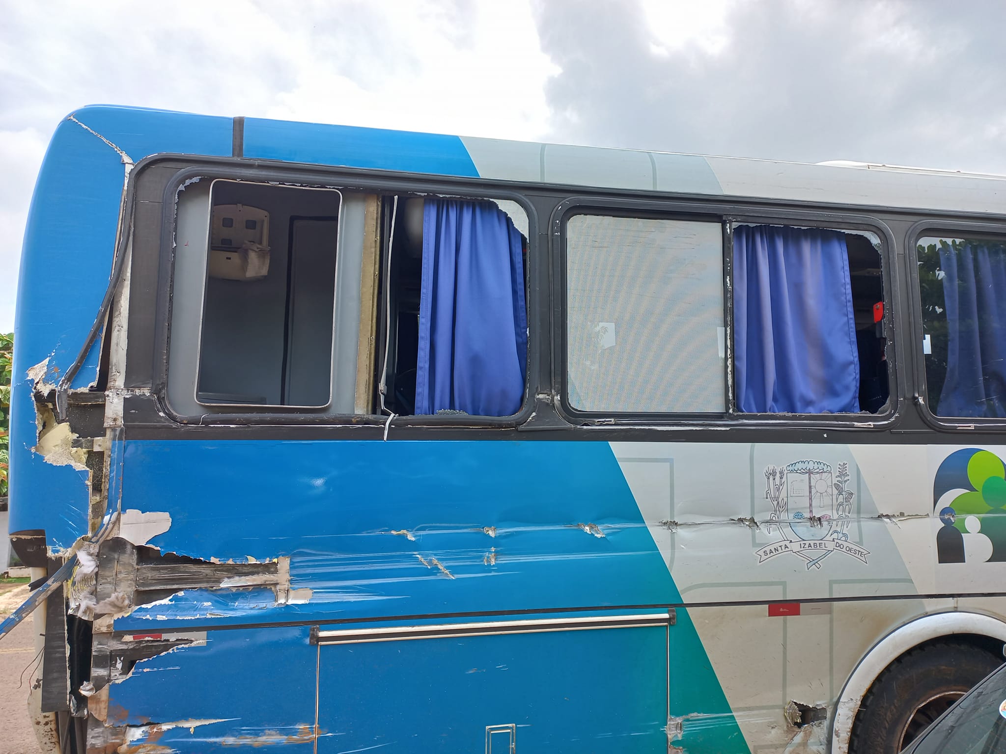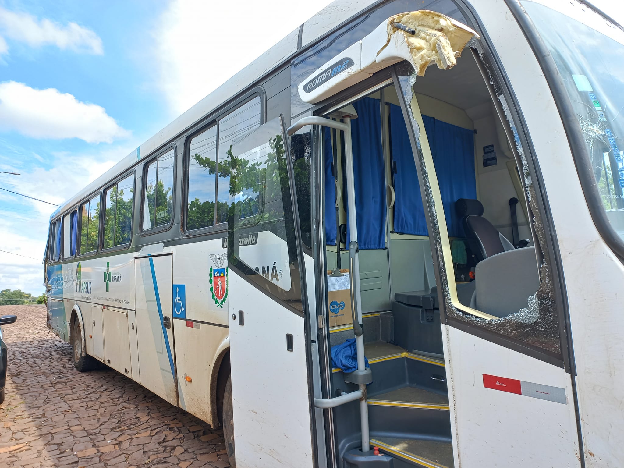 O coletivo teve três janelas quebradas, porta danificada e a lataria sofreu grandes estragos.