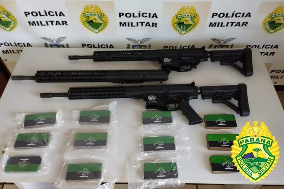 Realizada a desmontagem do painel, foram localizados três fuzis marca Colt calibre 7,62, dois deles completos e o terceiro sem a coronha e tabletes de maconha que totalizaram 1.240g, que o abordado informou seriam entregues em Francisco Beltrão.
