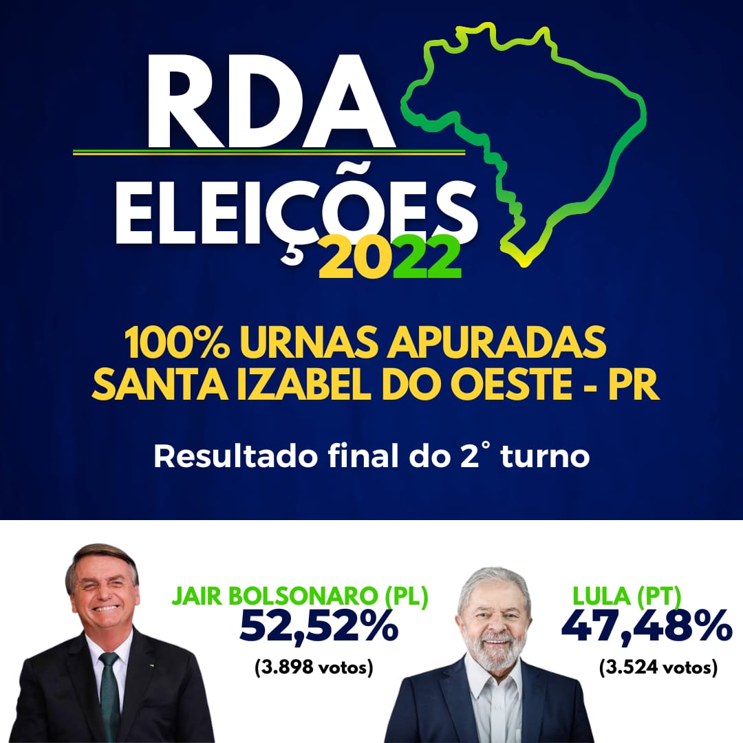 Com 100% das urnas apuradas em Santa Izabel do Oeste, o atual presidente Jair Bolsonaro (PL) teve a maioria dos votos totalizando 3.898. O candidato Luiz Inácio Lula da Silva (PT) recebeu 3.524 votos. A diferença é de 374 votos.