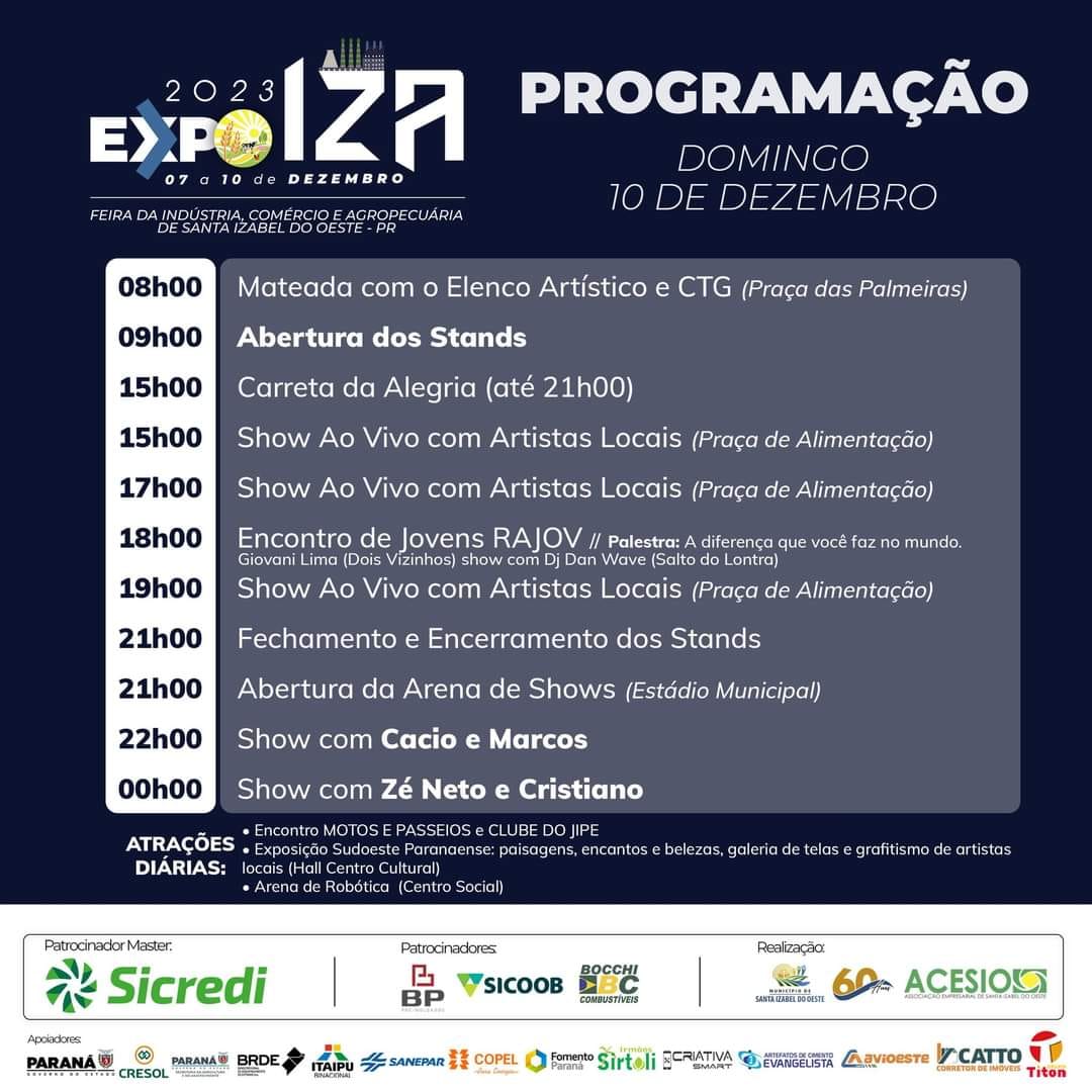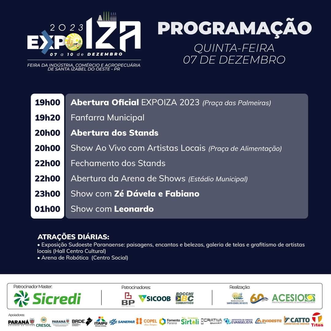 De 07 a 10 de dezembro acontece a 4ª Expoiza em comemoração do aniversário de 60 anos de Emancipação Política e toda população izabelense e da região, estão convidados a participarem da Expoiza - Feira da Indústria, Comércio e Agropecuária de Santa Izabel do Oeste.