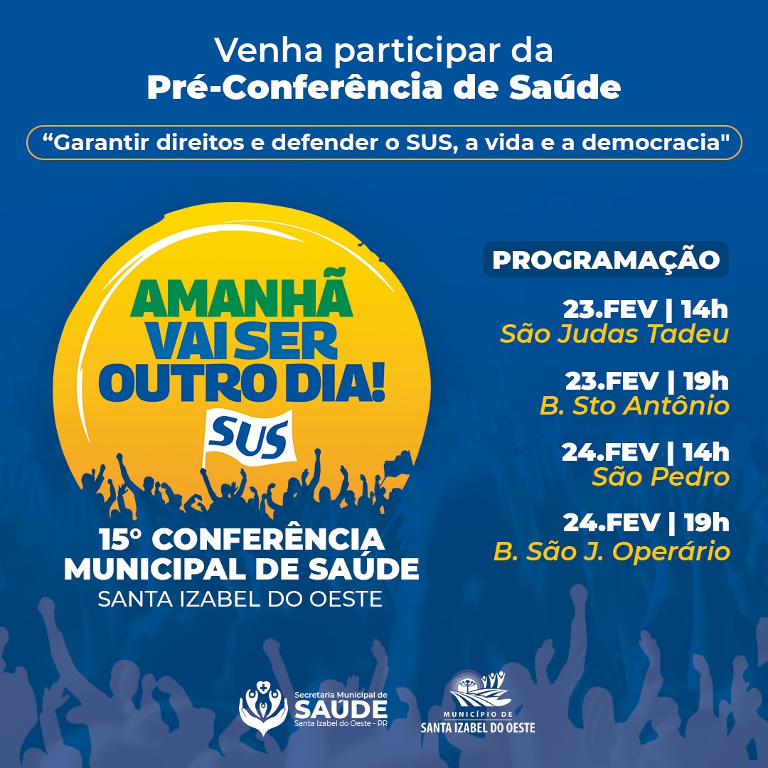 A 15ª Conferência Municipal de Saúde de Santa Izabel do Oeste, será realizada no dia 10 de março no Centro do Idoso, mas antes será realizada as Pré-Conferências, que têm o objetivo de constituir o conjunto de diretrizes a serem discutidas com tema “Garantir Direitos e Defender o SUS, a Vida e a Democracia.