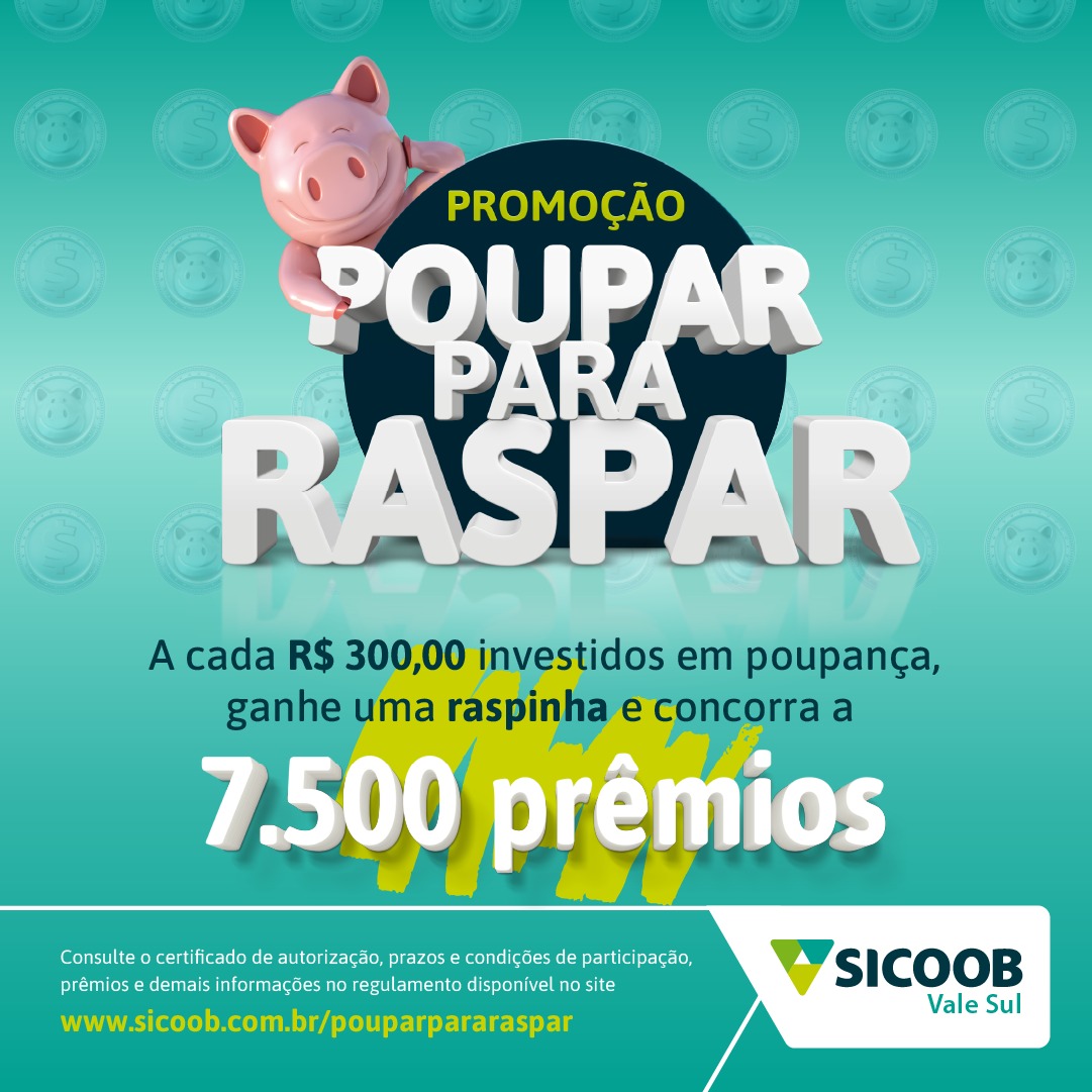 A cada 300 reais investidos na Poupança Sicoob, o poupador ganha uma raspinha e concorre a vários prêmios da Cooperativa. Os prêmios são diversos brindes da Cooperativa, iniciando pelo mascote, o porquinho da poupança Sicoob, passando por bonés, chapéus, bolas, kits de chimarrão, caixas de som portáteis, kit churrasco e bicicletas.